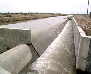 «Se licitó este año el canal para abastecer de agua en cabecera a la Sección II. Esto nos permitirá arrancar con otras 6 ó 7 mil hectáreas más para empezar a adjudicar» dijo el presidente del EPRC. Foto: Canal con decantador que lleva agua al proyecto productivo de «Zille».