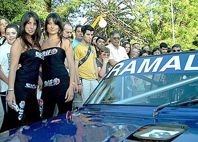 Juan María Traverso visitó la ciudad de General Pico auspiciado por la firma local «El Surco Tractores», promocionando la marca de lubricantes «Elf». Muchos seguidores se acercaron a solicitar un autógrafo al ídolo del automovilismo, que estuvo siempre acompañado por las tres «máquinas» que vemos en la foto: el Torino y las dos bellezas que llevaron los relojes a más 7.000 rpm.