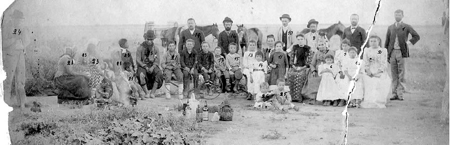 ![]() Primeros Pobladores de Santa Rosa. Fotografía realizada el 6 de enero de 1894. Este retrato fue obtenido por el fotógrafo Bernardo Graff. Era un día de fiesta en la chacra del señor Safontás.En la foto aparecen: 1) León Safontás; 2) Antonieta Pocho; 3) Augusto Pocho; 4) Ernestina Monnier; 5) Ida Monnier; 6) Rosita Monnier; 7) la Sra. de Roux, nuestra primera maestra; 8) el hijo de Madama Roux; 9) Ana Pocho; 10) Emilio Libis (padre); 11) María Oarriz; 12) la Sra. de Pocho; 13) María Pocho; 14) Agueda Salas; 15) Antonio Salas (hijo); 16) Pedro Bigani; 17) Emilio Libis (hijo); 18) Edgard Monnier (hijo); 19) Carlos Monnier (padre); 20) Juan Monnier (hijo); 21) Amadeo Isaguirre; 22) sin detalle; 23) el indio «Pancho» Francisco y familia; 24) Basilio Bordis; 25) Alfonso Salas (hijo) y 26) Augusto Pocho (hijo). |