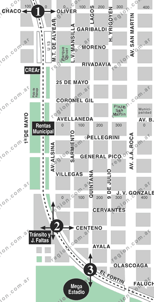 1) En calle Chaco continuación con Oliver; 2) En el encuentro de las calles Centeno y Alsina, para atravesar las vías y poder ingresar a las dependencias municipales de la nueva Dirección Municipal de Tránsito y Juzgado de Faltas, a instalrse en terrenos del ex Molino Werner; 3) En la calle Quintana para que el cruce de vías permita agilizar el contacto con el nuevo Megaestadio a construirse en el Parque Don Tomás sobre la continuación de la calle Stieben paralela a las vías.