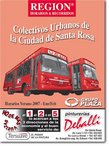 Se trata de un suplemento informativo de los recorridos y horarios de los colectivos que prestan servicio urbano en la ciudad de Santa Rosa. El ejemplar bicolor en tamaño bolsillo, resulta de suma utilidad para el usuario, está impreso en papel brillante de primera calidad y será de distribución gratuita.